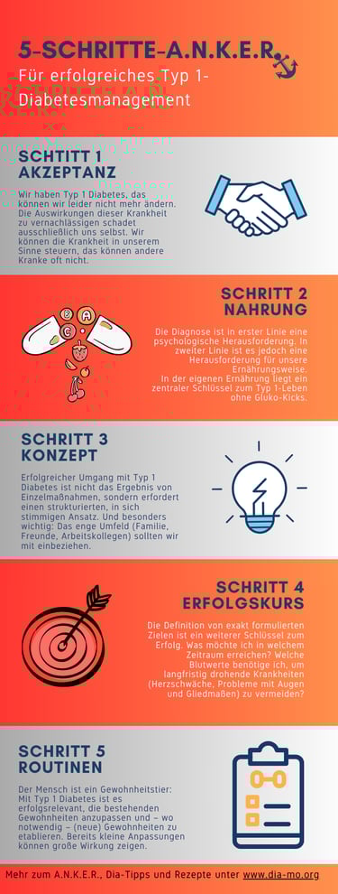 Nach 18 Monaten überwältigend positiver Fortschritte bei meinem Diabetesmanagement habe ich beschlossen, diese Erkenntnisse auch für andere Betroffene systematisch aufzubereiten. Dabei kam dieser 5-Schritte-A.N.K.E.R. heraus. Wenn er auch nur einer Person nachhaltig helfen kann, dann hat es sich gelohnt.