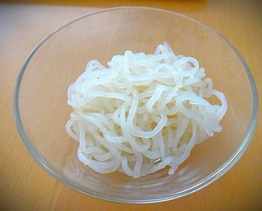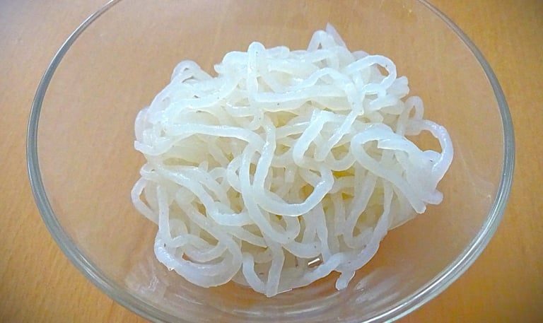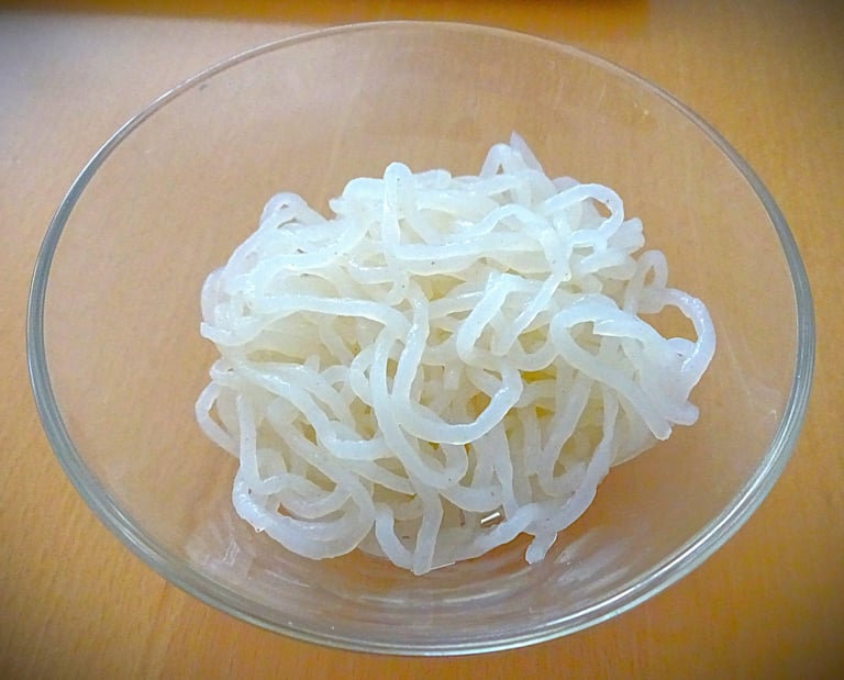 Werden aus dem Mehl der Konjakwurzel und Wasser hergestellt, sind arm an Kalorien und Kohlenhydraten. Eignen sich hervorragend für Typ 1 Diabetiker als Ersatz für stärkehaltige Nudeln und Reis. Enthalten kein Gluten und sind reich an Ballaststoffen. Konjakprodukte sollten vor dem Gebrauch gründlich mit (heißem) Wasser abgespült und gekocht oder gebraten werden. Nehmen den Geschmack von Soßen und Gewürzen gut auf. Der Geruch beim Öffnen kann unangenehm sein, verflüchtigt sich jedoch beim Abspülen und sollte nicht abschrecken.