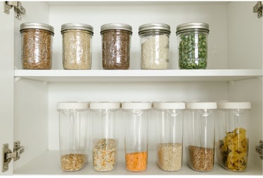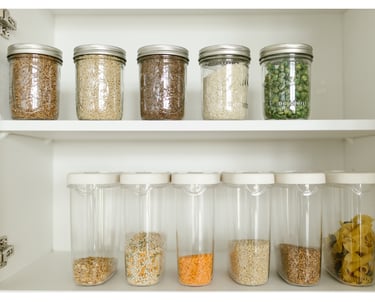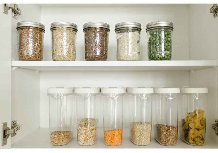 Nachdem ich mir ein Konzept für meine angepasste, nährstoffdichte Ernährungsweise zugelegt habe, habe ich die relevanten Lebensmittel an einen Ort in großen Tupperdosen zusammengeführt. Dabei habe ich die Erfahrung gemacht, dass nicht die Verwendung der neuen Lebensmittel eine Ernährungsumstellung verkompliziert, sondern deren mangelnde Organisation. Ob ich eine Weizenmehlsorte verwende oder aus einer Kiste drei Ersatzprodukte nehme, verzögert die Ausführung des Rezepts um maximal eine Minute. Hingegen habe ich bei meinen Eltern in verschiedenen Schränken nach den Zutaten suchen müssen und bin schier verzweifelt. Neben einer schlechten Laune hatte ich die Lust auf mein eigenes Rezept verloren. Es war mir schlicht zu kompliziert. Eine Erfahrung, die ich in meinem entsprechend organisierten Zuhause (Zweizimmerwohnung mit einer 8 qm Küche) nie mache.